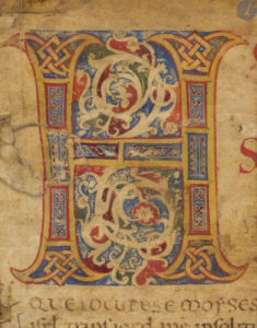 [ENLUMINURE]. — Initiale « H » ornée. — Fragment extrait d’une Bible. — Tempera et gouache sur parchemin. — Italie, Rome/Ombrie ou Toscane ?, vers 1175-1200. — Dimensions : feuillet (H. 127 x L. 102 mm) ; initiale (H. 95 x L....