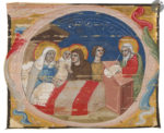 [ENLUMINURE]. — Ensemble de deux enluminures du XIVe siècle — Initiale « D » historiée. — Naissance de saint Jean-Baptiste — Fragment d’un antiphonaire. — Tempera, gouache, encre et or bruni sur parchemin. — Italie, Bologne,...
