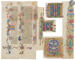 [ENLUMINURE]. — Ensemble de fragments d’enluminures XIVe-XVe siècles — Montage de six fragments [extraits de manuscrits enluminés italiens]. — Pièces contrecollées. — Sous encadrement. — De gauche à droite : — 1 et 2.