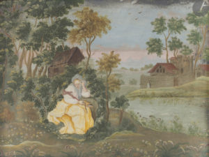 [ENLUMINURE] — Sainte ermite en pénitence [Marie-Madeleine en pénitence ?] — Miniature sur parchemin (encadrée), encre et gouache. — France, XVIIe siècle.
