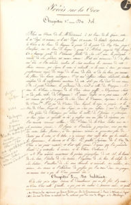 « Ce manuscrit provient de la bibliothèque de mon grand-père Sgio Ghjacumu Felice ». Puis en dessous, toujours au crayon de la même main « […] avait [été] recopié par un cousin Limperani de Penta di Casinca d’où ma grand-mère était originaire (la famille de cette dernière étant venue du sud de l’ile) ». La même main a commenté et annoté au crayon dans les marges du manuscrit.