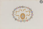 onglets, chiffres et armoiries formant les compositions le plus souvent gravés et contrecollés pour composer les dessins et compositions qui rehaussent les dessins, identifications des armoiries et chiffres à l’encre brune placés en regard des aquarelles.