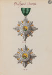Les décorations relèvent de l’Ordre impérial du lion et du soleil qui fut créé en 1808 par Fath Ali Shah Qajar (1797-1834) pour honorer le Major-Général Malcom et répondre à son cadeau de « pomme de terre ». Comme Malcom refuse le premier « Ordre du Soleil », l’assimilant à la France, il se voit présenter un lion couchant et soleil avec les titres de Khan et Sepahdar en 1810, et reçoit les honneurs du chevalier en 1812. L’ordre, qui est composé de trois classes, est un prix d’honneur offert aux étrangers ayant rendu d’importants services à la Perse. Les Musulmans n’y ont pas accès. En 1836, Mohammed Shah Qajar (1808-1848) apporte des modifications aux décorations notamment au niveau des rubans pris en compte dans ce manuscrit : ceci permet d’avancer une date probable de circa 1836. Par la suite, de nombreuses modifications sont portées aux décorations et conditions d’attribution de l’Ordre qui devient obsolète en 1939, puis renait sous la dynastie Pallavi (1925-1979) sous le nom de l’Ordre du Homayoun. Ces Ordres sont abolis avec la Révolution iranienne en 1979.