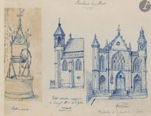 [NIÈVRE]. — [MOULINS-ENGILBERT]. — [DUMOULIN (Louis)]. — Calques et dessins. — En français, dessins à l’encre (parfois rehaussés de couleur) sur calque et papier. — France, Moulins-Engilbert (ou Nevers ?), 1901. — Feuillet copié...