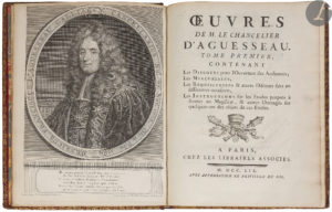 AGUESSEAU (Henri François d’). — Œuvres. — Paris : Les libraires associés, 1759 (1761)-1783. — 12 volumes in-4 (sur 13), 254 x 197 : I. portrait, xliv pp., (1 f.), pp. (xlv)-cxlviij, 622 pp. ;  II. xxxvj, 692 pp. ;  III. xxiv, 822...