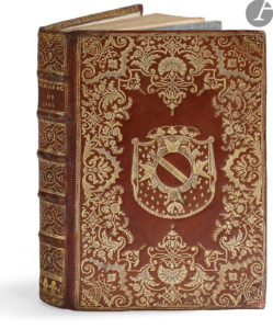 Maroquin rouge, plaque rocaille dorée en encadrement et armes dorées au centre sur les plats, dos à nerfs orné, roulette dorée intérieure, doublures et gardes de tabis bleu, tranches dorées (reliure de l’époque).