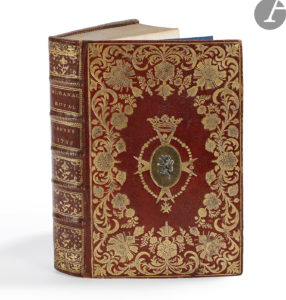 Exemplaire orné sur les plats d’une belle plaque florale dorée en encadrement que certains attribuent à Dubuisson mais que l’on trouve essentiellement sur des reliures datant des années 1780. Il porte au centre les armes dorées et mosaïquées d’un membre de la famille De Reynaud de Monts originaire d’Auvergne.