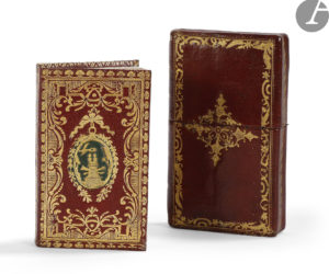 Maroquin rouge, plaque dorée en encadrement sur les plats, entourant au centre un médaillon ovale de maroquin vert foncé entouré de feuillage et d’un ruban dorés, orné d’un autel sur lequel sont posés deux cœurs enflammés et au-dessus duquel vole une colombe tenant une couronne de laurier, dos lisse orné, miroir au premier contreplat entouré de galons dorés, pochette de tabis bleu au deuxième contreplat, gardes de tabis bleu et de papier dominoté, tranches dorées, étui à coulisse de maroquin rouge, orné sur les plats d’une roulette dorée en encadrement et de fers dorés au centre (reliure de l’époque).