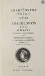 ANACRÉON. — Anacreontis teii Odaria. Praefixo commentario quo poetae genus traditur et bibliotheca Anacreonteia adumbratur.— Additis var lectionibus. — Parme : ex regio typographeio [Bodoni], [15 septembre 1784]. — Grand in-8, 249 x...