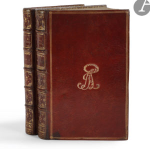 Maroquin rouge, triple filet doré en encadrement et chiffre doré au centre sur les plats, dos à nerfs orné, roulette dorée intérieure, tranches dorées (reliure de l’époque).