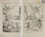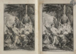 L’exemplaire fut enrichi, postérieurement à la vente Piat, d’une épreuve avant la lettre et non terminée du premier frontispice et de la planche du second volume, les 2 coupées à hauteur de la cuvette puis collées par les bords sur papier vergé. L’épreuve de la planche porte des indications à la mine de plomb. On y trouve, également ajoutée, l’eau-forte pure de la première planche ainsi que le dessin original de cette gravure, attribuable à Marillier.