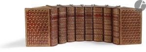 Restauration discrète à certains coins, petit manque à la coiffe de tête du premier volume, et de rares traces d’épidermures. Ces défauts mineurs n’altèrent en rien l’attrait de cet exemplaire des plus luxueux.