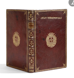 L’exemplaire fut par la suite offert au Vicomte d’Ermenonville, avec ex-dono en lettres capitales dorées sur le premier plat. Celui qui possédait ce titre était Stanislas Comte de Girardin (1762-1827), homme politique, général puis Comte d’Empire mais également musicien et dessinateur. Il eut Jean-Jacques Rousseau comme précepteur.