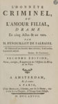 FENOUILLOT DE FALBAIRE (Charles-Georges). — L’Honnête criminel, ou l’amour filial, drame En cinq Actes & en vers. — Amsterdam, Paris : Merlin, 1768. — In-8, 197 x 124 : xiv, 90 pp., 5 planches.