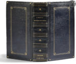 Maroquin bleu foncé, double encadrement de filets à froid et dorés avec fleuron doré aux angles sur les plats, dos à nerfs orné de motifs dorés et à froid, filets dorés intérieurs, gardes de parchemin, non rogné, emboîtage demi-maroquin noir (Simier R. du roi pour la reliure et James Macdonald à New York pour l’emboîtage).
