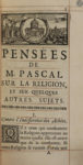 PASCAL (Blaise). — Pensées de M. Pascal Sur la religion et sur quelques autres sujets, Qui ont esté trouvées après sa mort parmy ses papiers. — Paris : Guillaume Desprez, 1670. — In-12, 157 x 85 : (41 ff.), 365 pp., (10 ff.).