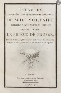 – 93 compositions de Moreau le Jeune, dont 44 pour le théâtre, 10 pour La Henriade, 21 pour La Pucelle, 4 pour les contes en vers et 14 pour les romans. On trouve en tête du premier volume le titre gravé pour cette série d’estampes, intitulé « Estampes destinées à orner les éditions de M. de Voltaire » et la dédicace gravée de Moreau Le Jeune au roi de Prusse.