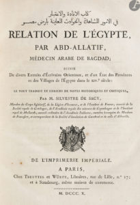 Il s’agit de l’un des plus importants ouvrages publiés par ce dernier. La relation qu’il donne a été composée au XIIIe siècle par Muwaffaq al-Dīn Abd al-Latif al-Baġdādī (1162-1231), médecin arabe originaire de Bagdad, l’un des praticiens les plus célèbres de son temps. Elle est divisée en deux parties. La première traite de la situation et du climat de l’Égypte, de ses plantes, des animaux, des monuments antiques, des édifices, des navires et des différentes sortes de nourritures. La seconde porte sur le Nil et ses particularités ainsi que sur la peste qui sévit en Égypte en 1201 et 1202, époque où l’auteur était lui-même en Égypte.