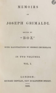 *DICKENS (Charles). — Memoirs of Joseph Grimaldi edited by “Boz”. — Londres : Richard Bentley, 1838. — 2 volumes in-12, 186 x 112 : portrait, xix pp., (1 f.), 288 pp., 6 planches ; frontispice, ix, 263 pp., 5 planches.
