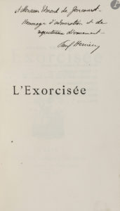 *HERVIEU (Paul). — L’Exorcisée. — Notes sur la société. — Paris : Alphonse Lemerre, 1891. — In-18, 186 x 115 : (4 ff. premier blanc), 239 pp., (2 ff.), couverture imprimée.