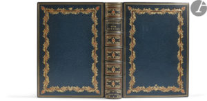 Maroquin bleu, listel de maroquin brun entouré d’une guirlande florale dorée et mosaïquée, et double filet doré en encadrement sur les plats, dos à nerfs orné dans le même esprit, dentelle dorée intérieure, tranches dorées sur témoins, couverture et dos conservés (Champs).