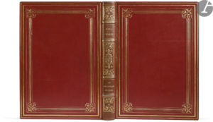 Veau rose, encadrement doré sur les plats, composé de filets et de quatre fleurons aux angles, dos à nerfs orné, roulette dorée intérieure, doublures et gardes de soie moirée bleue, doubles gardes, tranches dorées sur témoins, couverture et dos conservés, étui (Durvand).