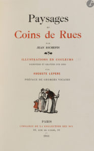 RICHEPIN (Jean) – LEPÈRE (Auguste). — Paysages et Coins de Rues… — Préface de Georges Vicaire. — Paris : Librairie de la Collection des dix, 1900. — In-8, 241 x 161 : (2 ff.), XII, 157 pp., (1 f.), couverture illustrée.