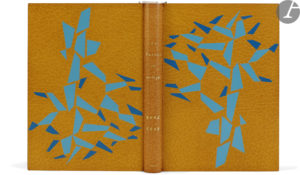 Maroquin citron, plats ornés d’un décor abstrait de papiers laqués bleu foncé et bleu clair, dos lisse, tête dorée, non rogné, couverture et dos conservés, étui bordé (Devauchelle).
