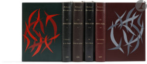 Maroquin vert foncé (I), brun foncé (II), noir (III) et bordeaux (IV), plats ornés d’un décor abstrait de papiers laqués de différents tons selon les volumes, dos lisse, tête dorée, non rogné, couverture et dos conservés (Devauchelle).