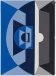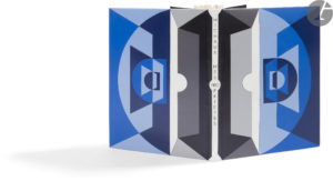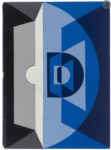 Reliure composée d’un décor géométrique mosaïqué de box de blanc, noir, gris, gris foncé, et différents tons de bleus, dos lisse, doublures de daim bleu bordé d’un filet doré, gardes de daim noir, tranches dorées sur témoins, couverture et dos conservés, chemise à dos et bandes à recouvrement de box bleu foncé, étui (P.L. Martin, 1961).