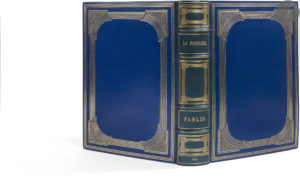 Maroquin bleu, filets dorés droits et courbes en encadrement et compartiment à fond criblé aux angles sur les plats, dos à nerfs orné dans le même esprit, doublures de maroquin gris orné de filets dorés en encadrement, gardes de soie moirée bleu foncé, doubles gardes, tranches dorées sur témoins, couverture et dos conservés, étui (Semet et Plumelle).