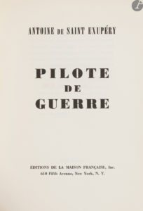 SAINT-EXUPÉRY (Antoine de). — Pilote de guerre. — New York : Éditions de la Maison française, [1942]. — In-4, 224 x 178 : 253 pp., (1 f. blanc), couverture imprimée.