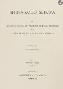 *UMEHARA (Sueji). — Shina-Kodo Seikwa or selected relics of ancient chinese bronzes from collections in Europe and America. — Osaka : Yamanaka & co, 1933. — 3 parties en 7 volumes in-folio, 387 x 304.