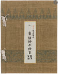 Reliure à la japonaise en toile verte imprimée, pièce de soie imprimée en japonais sur le premier plat, tranches dorées, chemise à rabats de toile verte.