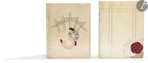 Parchemin à la bradel, fleurs dans le style Art déco dorées, argentées et mosaïquées de différents maroquins à l’angle inférieur droit du premier plat, deux doubles filets dorés verticaux parallèles sur les deux plats et un double filet doré horizontale en continu sur les plats et le dos, dos lisse, cadre de parchemin blanc à l’intérieur, doublures de soie moirée bleu foncé bordée d’un listel de maroquin bordeaux, gardes de soie moirée bleu foncé, doubles gardes, tranches dorées sur témoins, couverture et dos conservés, étui [La Boule de gui] ; Parchemin ivoire, composition dans le style Art déco composé de filets noirs, dorés, blancs et rouge sur le premier plat, dos lisse, doublures et gardes de soie moirée noire, doubles gardes, tranches dorées sur témoins, couverture et dos conservés, étui [Le Cabaret de la belle femme] (Marot-Rodde).