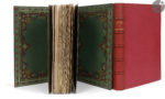 Maroquin vert janséniste, dos à nerfs, doublures de maroquin vert orné d’un riche encadrement fait de filets dorés, de listels et de motifs floraux mosaïqués de maroquin vert, havane et bleu, gardes de soie moirée verte, doubles gardes, tranches dorées sur témoins, chemise à dos et bandes à recouvrement de maroquin vert, étui [I] ; reliure identique en maroquin rose, pour le volume III ; parchemin ivoire marbré à la bradel, dos lisse, tranches dorées sur témoins, chemise à rabats et étui pour le second volume (Charles Lanoë).