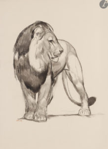 EXEMPLAIRE NOMINATIF, SPÉCIALEMENT IMPRIMÉ POUR PAUL JOUVE, enrichi d’un très beau dessin original au fusain et au crayon, représentant un lion et signé en rouge par l’artiste. Il fut réalisé sur un feuillet in-folio (450 x 328 mm) de papier vélin de Hollande.