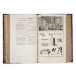 Paris, Neuchâtel, 1751-1765. 17 vol. de textes. - Recueil de planches sur les sciences, les arts libéraux, et les arts méchaniques… Amsterdam, Briasson, 1762-1772. 11 vol. - Nouveau dictionnaire pour servir de supplément aux dictionnaires des sciences, des arts et des métiers… 1767. 5 vol. - Table analytique et raisonnée des matières contenues dans les XXXIII volumes…, 1780. 2 vol. - 35 vol. in-folio, veau fauve (veau marbré pour les volumes de planches), dos à nerfs ornés, pièces de titre et de tomaison de maroquin rouges et vertes (rouges et citron pour les vol. de planches), tranches rouges (Reliures de l’époque).