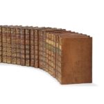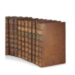 Rousseurs pâles à certains feuillets, d’autres uniformément roussis, dont des planches. Certaines gardes de papier marbré décollées. Restaurations aux reliures, frottements, taches, mors fendus, accrocs à quelques coiffes (souvent fragiles). Tome VIII Planches, mouillure marginale.