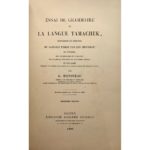 -joint : Essai de grammaire de la langue Tamachek. Alger, A. Jourdan, 1896. In-8 pleine toile, couverture conservée, xxxi-299 pp. avec 6 facsimilés dépliants d’écriture tifinar et 1 carte dépliante en couleurs indiquant les parties de l’Algérie où la langue berbère est en usage et 3 planches repliées de facsimilés de caractères Tifinar, ouvrage couronné par l’institut en 1860.