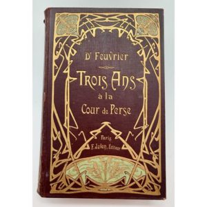 -FEUVRIER (Joannès). Trois ans à la cour de Perse. Paris, F. Juven, s.d. (1890) ; in-8 percaline de l’éditeur, plat et dos orné, tranches dorés, vi-452 pp. avec 1 portrait de l’auteur en frontispice, 4 planches en couleur, 4 cartes, 1 plan et 79 illustrations d’après des photographies inédites et des croquis de l’auteur, édition originale. L’auteur était médecin du Shah de Perse Nasr ed-Din. Frontispice détaché. Percaline usagée, coutures lâches.