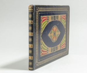 ALBUM AMIRORUM. Environ 31 pp. écrites et nombreux feuillets blancs. In-4 à l'italienne, maroquin bleu nuit à la cathédrale avec pièces de maroquin rouge, vert et citron mosaïquées, roulettes et filets dorés, repris sur le dos à faux-nerfs, cinq filets dorés intérieurs, tranches dorées (étiquette du papetier Roche, à Paris). Une coiffe arrachée, frottements aux angles.