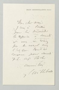 « Mon cher ami, J'écris à Bellio pour lui demander la remise à samedi. Si vous ne recevez pas de nouvel avis c'est que tout est convenu pour samedi. 7h café Riche. Amitiés. G. Caillebotte. »