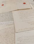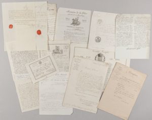 Documents concernant essentiellement la carrière militaire de plusieurs membres de la famille de Chevigné : nomination de capitaine garde-côte de St Nazaire (1748), certificat d'amnistie signé par Fouché, fac-similé de lettre de Marie-Antoinette, beau passeport délivré par la commune de Vannes (an 8), brevet de l'Armée royale signé par le comte d'Andigné (Candé, mai 1815), certificats militaires signés par le marquis de Coigny, le duc d'Uzès, autorisation de résider à Londres au sein de la légion de Pfaffenhoffen (1795), lettres du comte de Béthisy, du comte de Chasseloup, du maréchal Soult (1831), du cardinal Caprara, affiche sur l'organisation des gardes nationales, certificat de l'École Royale militaire de La Flèche, etc.