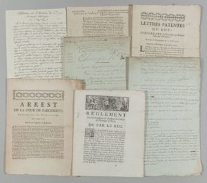 - 4 imprimés du XVIIIe : Règlement pour les professeurs et étudiants du Collège de chirurgie de Paris (12 pp. in-4, 1763). Lettres-patentes du Roy concernant les privilèges et exemptions des chirurgiens (4 pp. in-4, 1756). Lettres patentes portant règlement pour l'agrégation des maîtres en chirurgie dans les villes du Royaume (6 pp. in-4, 1750). Arrest de la Cour de Parlement concernant les chirurgiens (4 pp. in-4, 1761).