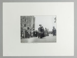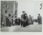 Winston Churchill, défilant avec les membres de l'ordre de la jarretière, vêtu de la tenue traditionnelle de cette confrérie : bonnet avec plumes d'autruches et cape avec l'écusson « Honi soit qui mal y pense ».