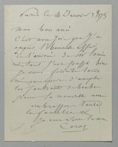 COROT, Camille (1796-1875). Lettre autographe signée, à « mon bon ami ». 1 p. in-16. Paris, 4 janvier 1873.