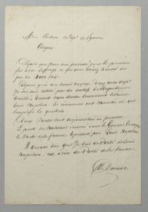 Importante déclaration de soutien à Louis-Napoléon Bonaparte pour les élections présidentielles de 1848. « Depuis que je me suis présenté pour le première fois à vos suffrages et que vous m'avez honoré de près de 4000 voix. Depuis qu'à un second voyage dans votre département je me suis retiré par des motifs de respectueuse amitié, devant mon illustre concurrent le Prince Louis Napoléon, les événements ont marché et ont simplifié la question. Deux partis sont aujourd'hui en présence. Le parti national incarné par le général Cavaignac. Le parti de la France représenté par Louis Napoléon. Il va sans dire que je suis du parti de Louis Napoléon, c'est à dire du parti de la France. Alex. Dumas ».