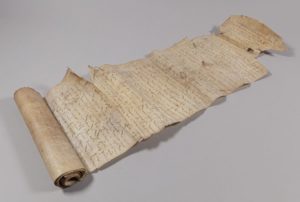GARD. Rouleau de Parchemin. Août 1560. 240 x 26 cm, formé de 5 peaux cousues. Déchirure avec lacune de texte dans la partie supérieure droite..