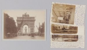 On joint : 3 clichés représentant les célébrations du centenaire de Victor Hugo. Tirages argentiques en noir et blanc, sur cartes postales 9 x 14 cm. Timbre et oblitérations postales au dos de chacune des cartes photographiques. Témoignage d'un photographe amateur (René Barberon), ayant immortalisé les célébrations qui se tinrent Place des Vosges, en l'honneur du grand homme, le 2 mars 1902. Avec légendes.